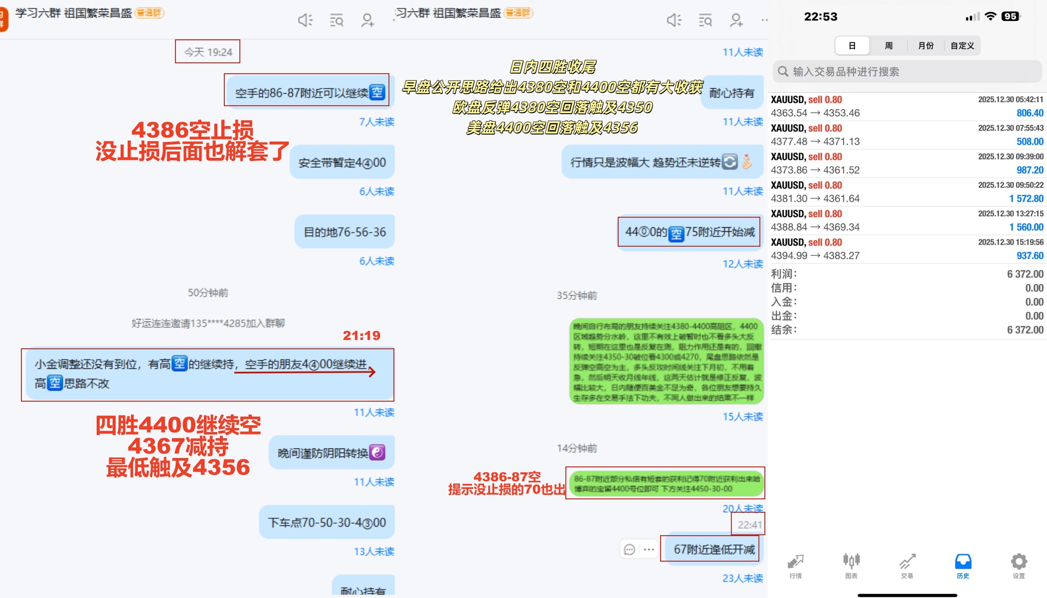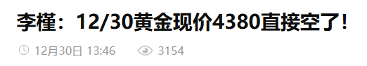 今日2025年年末,黄金上演过山车行情。周一黄金从上周五创下的历史高点4549大幅回落,最低触及4303,创下自10月21日以来的最大单日跌幅。昨日虽然没有弱势破位下行,但是美盘出现冲高回落,而且回落力度不小,隔夜直接来到了4328。我们昨日早盘公开给出的4380空和4400空都有不错的收获,其中4380空公开实时提示,欧盘最低触及4350。4400空隔夜来到4328,实战同步跟进,起床直接大幅收割。
